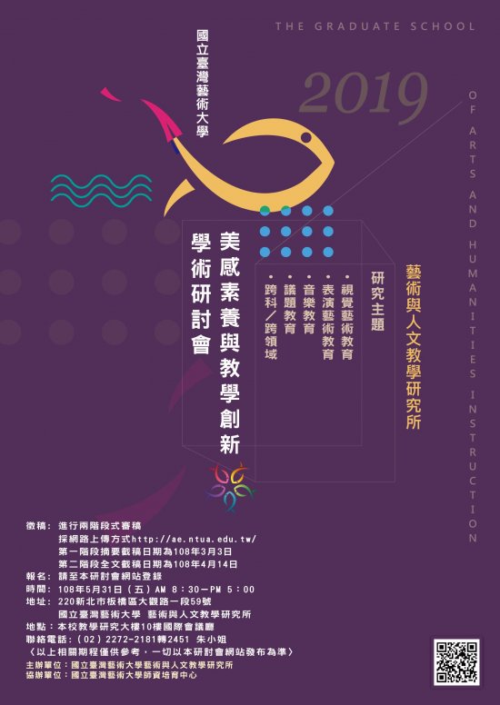 一、該研討會訂於108年5月31日(星期五)上午8點30分至下午5時舉行,地點為該校教研大樓10樓國際會議廳。 二、請准予全程參加者核發研習時數6小時。 三、徵稿自即日起自108年3月3日(星期日)止,採線上網路投稿,網址如下:http://ae.ntua.edu.tw/conference 四、檢附「2019美感素養與創新教學學術研討會」海報1份。