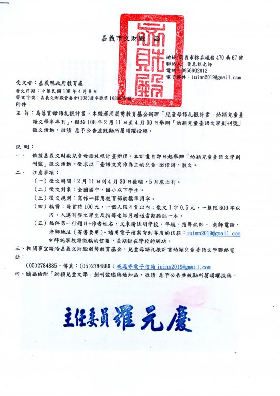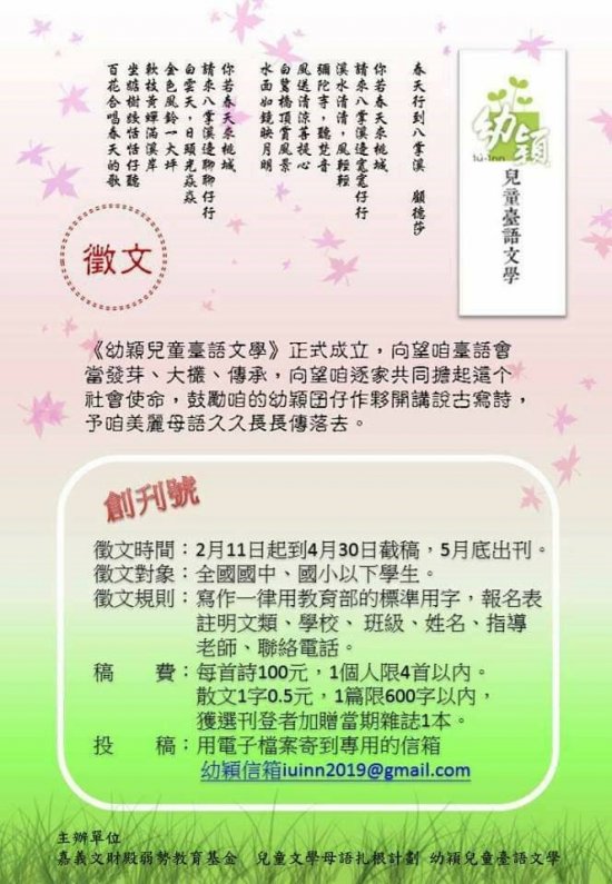 嘉義市文財殿辦理幼穎兒童臺語文學創刊號徵文活動,請踴躍投稿.