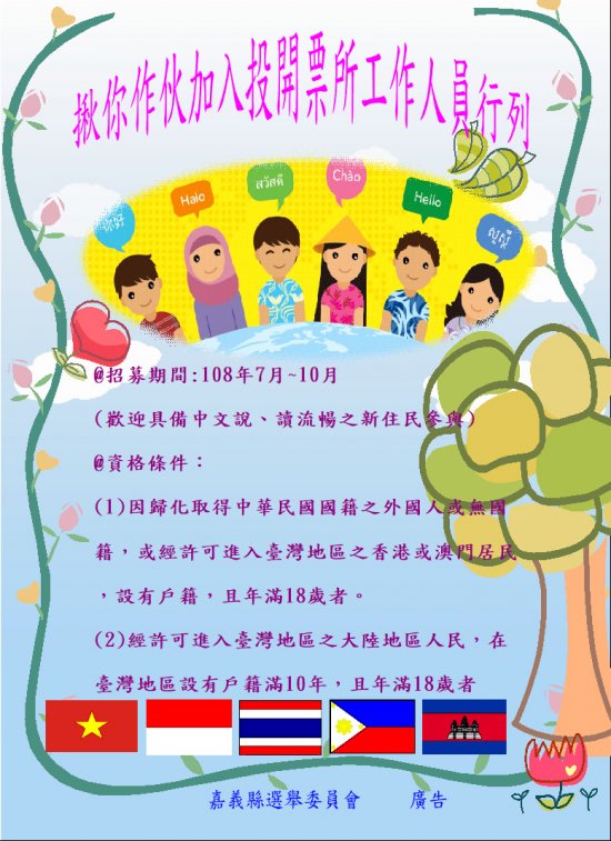 轉知「鼓勵新住民擔任第15任總統副總統及第10屆立法委員選舉投開票所工作人員」宣導海報電子檔