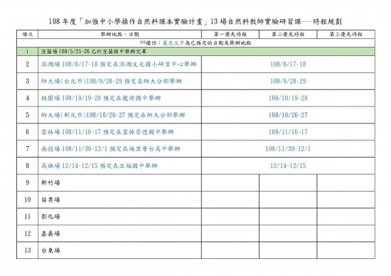一、 本計畫期程自108年5月1日至109年12月31日止共計辦理13場次,目前已訂定於108年底前辦理8場次,109年辦理5場次。(場次規劃表請參考附件一)