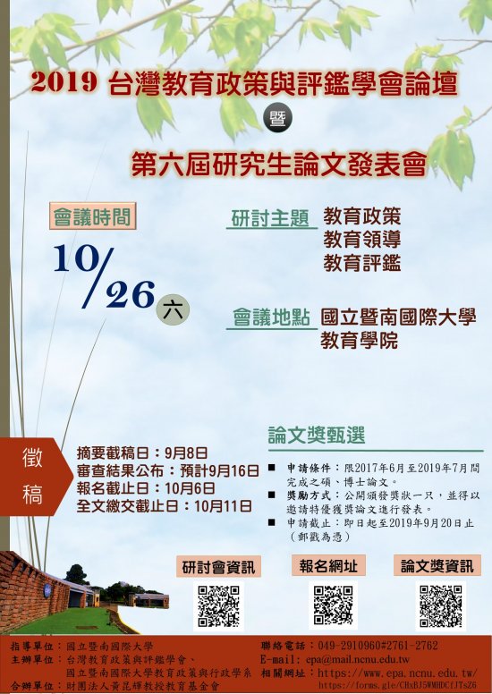 一、 旨揭研討會訂於108年10月26日(星期六)在國立暨南國際大學教育學院舉行。