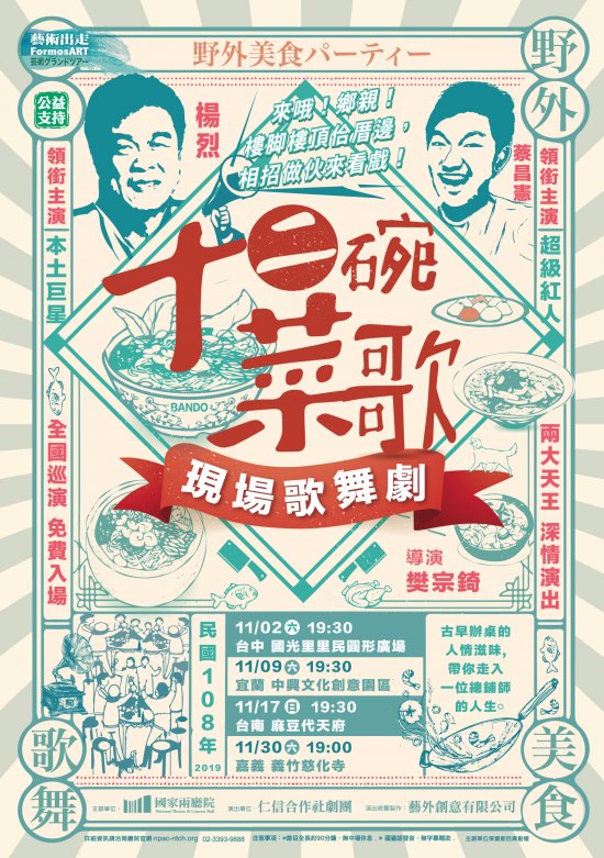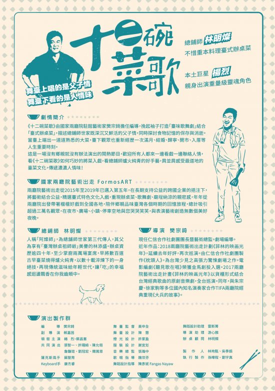 《十二碗菜歌》由國家兩廳院駐館藝術家-樊宗錡導演-擔任編導,挽起袖子打造「臺味歌舞劇」結合「臺式辦桌菜」,力邀國寶級總鋪師林明燦擔任辦桌顧問,本土巨星楊烈、超級紅人蔡昌憲領銜主演。