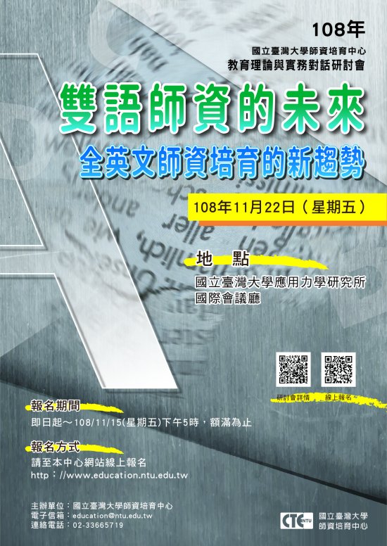 一、國立臺灣大學師資培育中心關注「全英文師資培育」議題,謹訂於108年11月22日(星期五)在臺灣大學應用力學研究所國際會議廳辦理旨揭研討會,邀請多位學者專家蒞臨討論,並與現場觀眾進行教育理論與實務的對話,期待透過意見交流集思廣益,匯聚推動全英文師資培育具體可行之作法及有效策略。