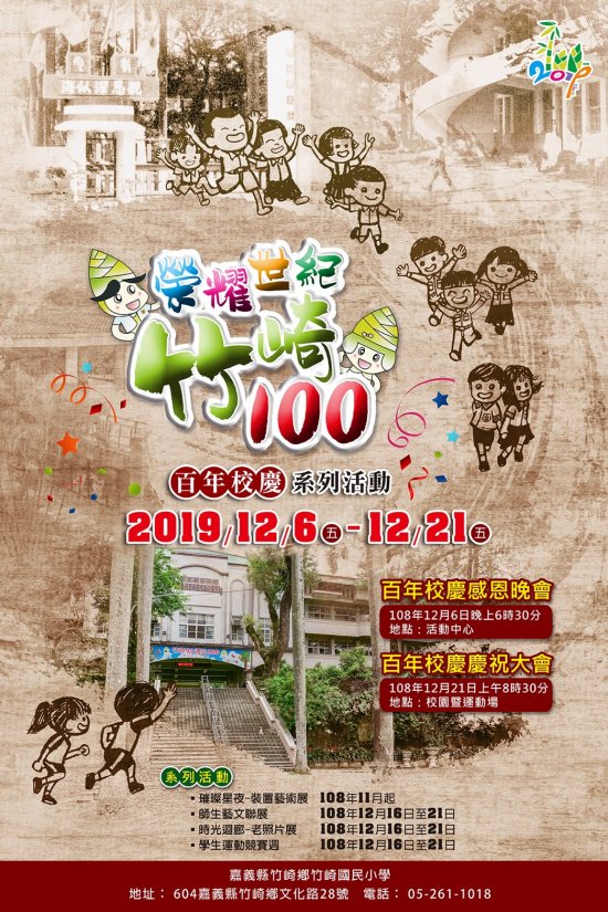 「榮耀世紀 竹崎100」百年校慶系列活動-三代以上同堂感恩晚會,於12月6日(星期五)晚上六時三十分在本校活動中心舉行,敬邀各校蒞臨指導