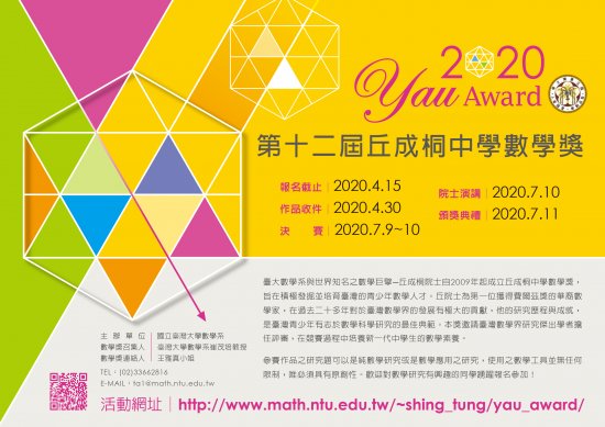 二、 為鼓勵並激發中學生對於數學研究的興趣和創造,該數學獎將提供金牌、銀牌、佳作和入選等獎項及獎金。相關活動訊息請逕上http://www.math.ntu.edu.tw/~shing_tung/yau_award/查詢。
