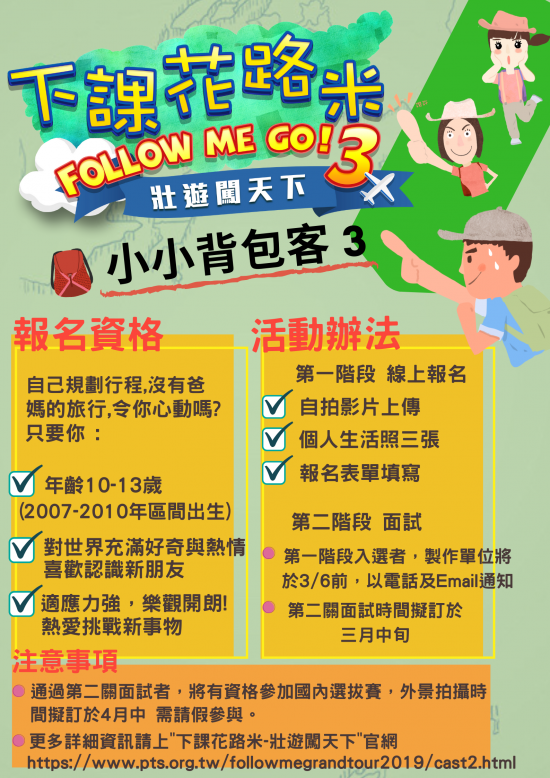 主旨:財團法人公共電視文化事業基金會 【下課花路米】舉辦之『小小背包客─壯遊闖天下』徵選活