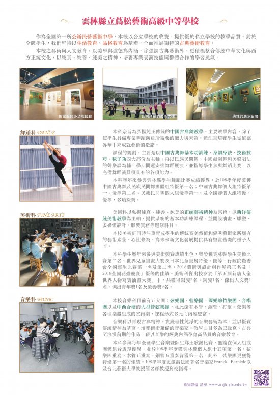 | 一、 | 該校辦學致力於「弘揚古典藝術,發揚傳統倫理道德,歸正人心」為宗旨,招收台灣與世界各地學生,培育舞蹈、美術、音樂藝術才能優異的學生,養成古典藝術與文化發展之專業人才。 |