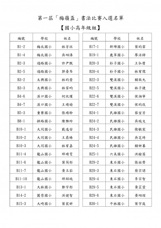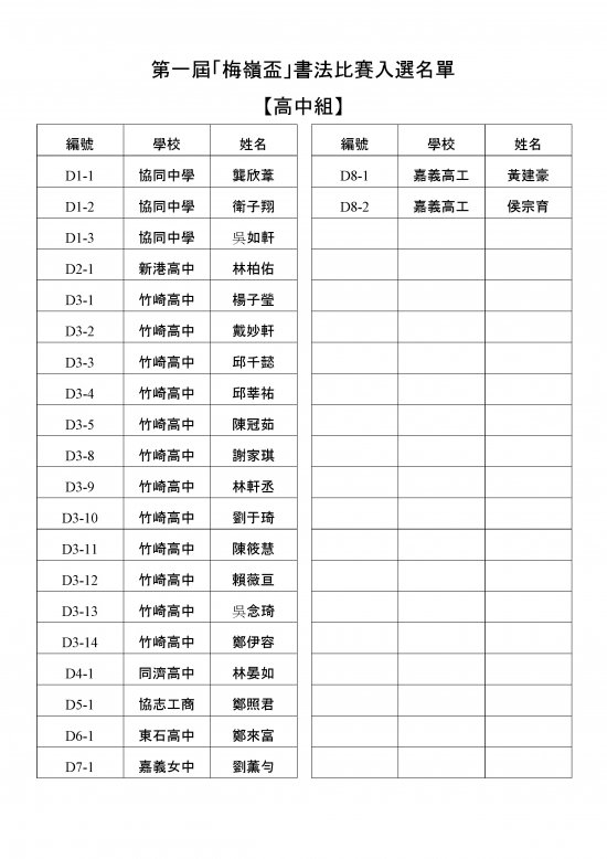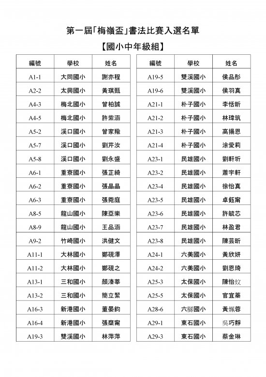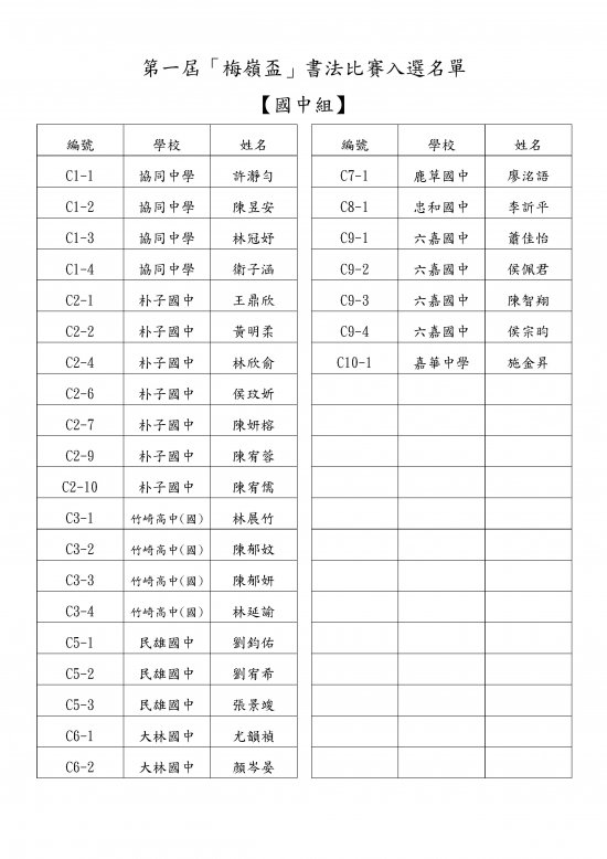 第一屆「梅嶺盃」書法比賽預賽成績公告