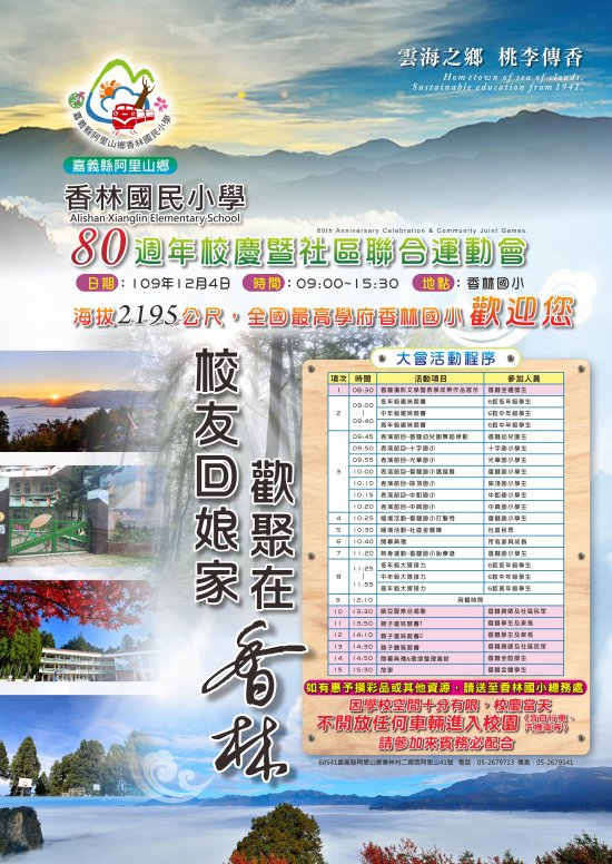 嘉義縣阿里山鄉香林國民小學謹訂於109年12月04日(星期五)上午8時30分舉行80週年校慶暨社區聯合運動會,誠摯歡迎長官、各界來賓、家長及校友蒞臨,感謝!