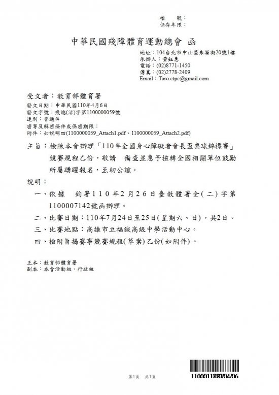 「110年全國身心障礙者會長盃桌球錦標賽」競賽規程