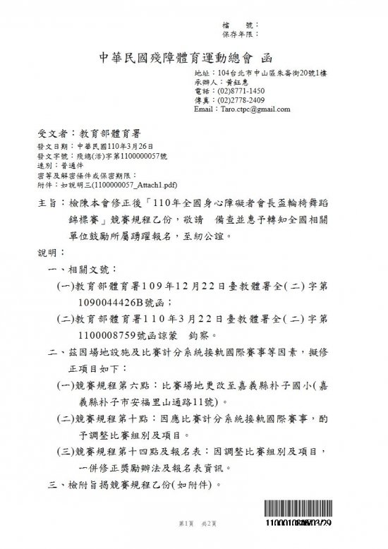 「110年全國身心障礙者會長盃輪椅舞蹈錦標賽」競賽規程