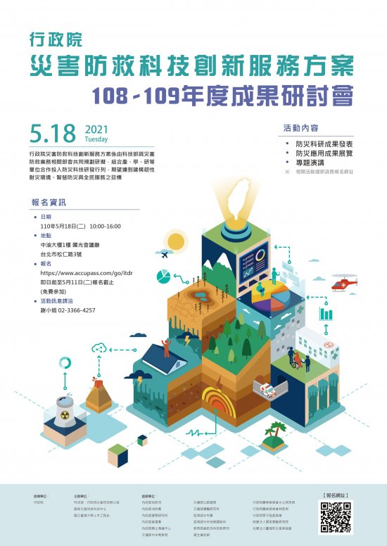 - 「行政院災害防救科技創新服務方案」係由科技部與災害防救業務相關部會共同規劃研擬,結合產、學、研等單位合作投入防災科技研發行列,期望達到建構韌性耐災環境、智慧防災與全民服務之目標。本方案於108-109年期間累積扎實之防災科技研發能量及具體亮點成果,乃與各參與推動單位將共同辦理成果研討會,以專題演講、互動攤位及主題展覽等活動方式,與各界防災夥伴共同交流,期望達到成果推廣與宣傳之效。