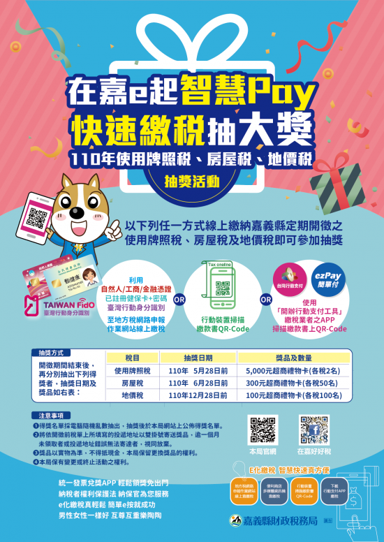 | 2、 | 活動資格與方式:於今年房屋稅定期開徵期開內,透過各項e化線上成功繳納「嘉義縣」110年定期開徵的房屋稅稅款,即可參加抽獎,有機會獲得5000元、300元或100元超商禮券。 |
