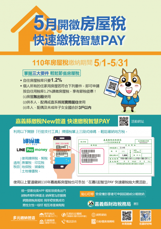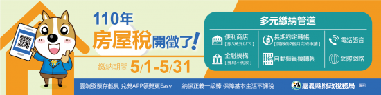 | (一) | 宣傳內容1:「110年房屋稅5月1日開徵! 請於5月31日前繳納110年房屋稅,以保障您權益,嘉義縣財政稅務局關心您!」。 |
