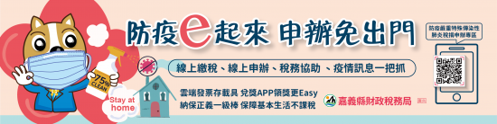 | (五) | 宣傳內容5:「納稅義務人受肺炎疫情影響,無法如期繳稅款者,可申請延期或分期繳納,欲知詳情請洽嘉義縣財政稅務局。」 |