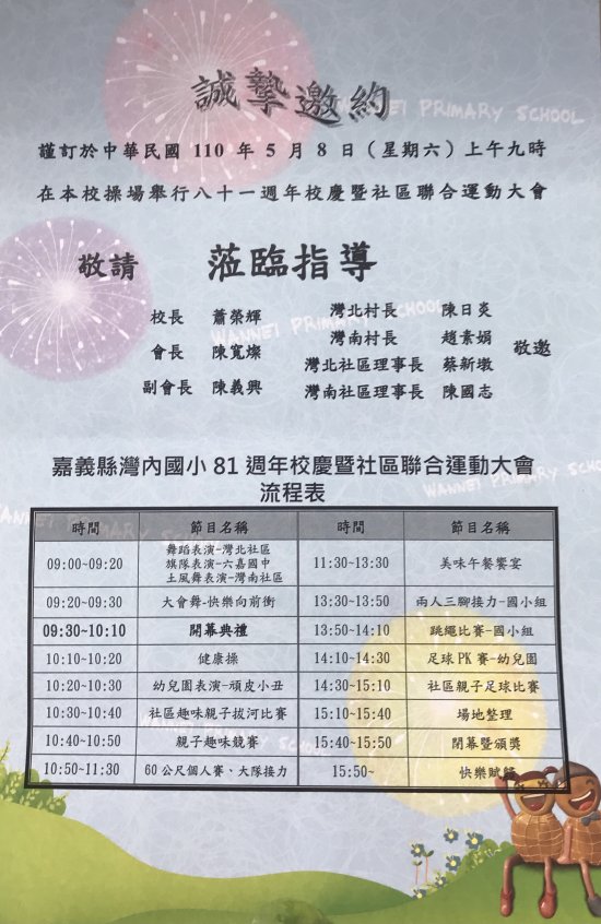 嘉義縣六腳鄉灣內國民小學謹訂於110年5月8日(星期六)上午9時舉行八十一週年校慶暨社區聯合運動會,誠摯邀請長官、各界來賓、家長及校友蒞臨指導,並於110年5月10日(星期一)補假一天,如有行政業務請逕洽相關承辦人員,感謝!