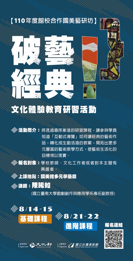 主旨:檢送國立臺灣美術館「110年度館校合作國美藝研坊─『破藝經典』文化體驗教育研習活動」簡章及海報各乙份,歡迎踴躍參加。