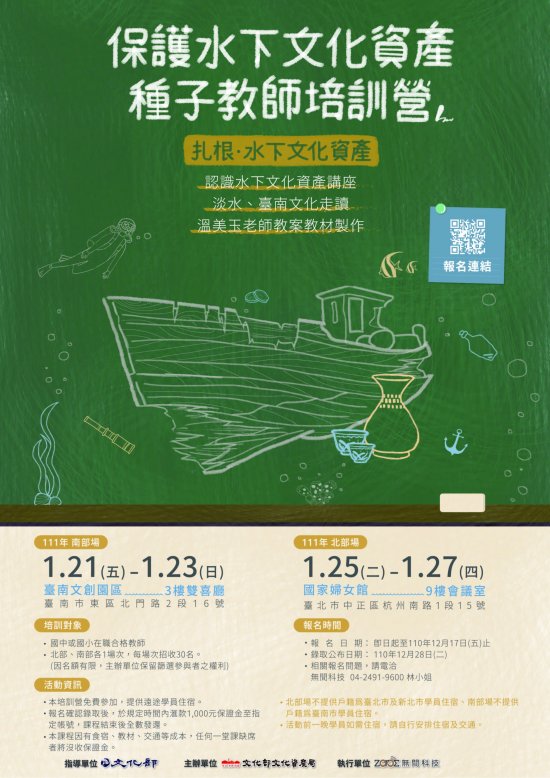 主旨:文化部文化資產局辦理南、北二場「保護水下文化資產種子教師培訓營」簡章,請協助公告周知並鼓勵踴躍報 名參加。 說明: 一、依據教育部110年12月6日臺教師(一)字第1100166482號函˙辦理。 二、首揭培訓營之培訓對象為國中或國小在職合格教師。北 部、南部各辦1場次,每場次招收30人,報名日期至110年12月17日止(詳見附件簡章)。 三、有關報名及活動相關事宜,請詳參活動簡章,或逕洽本案承辦人林小姐(04)2491-9600。