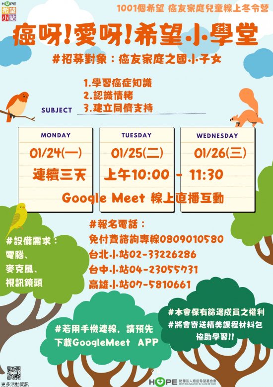 有關財團法人癌症希望基金會「1001個希望兒童線上冬令營」報名簡章,
