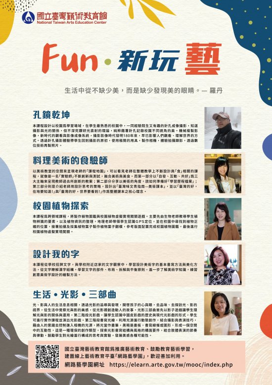 四、另,該館不定期舉辦「網路藝學園」課程推廣活動,歡迎關注臉書粉專訊息(https://www.facebook.com/ntaec /)。