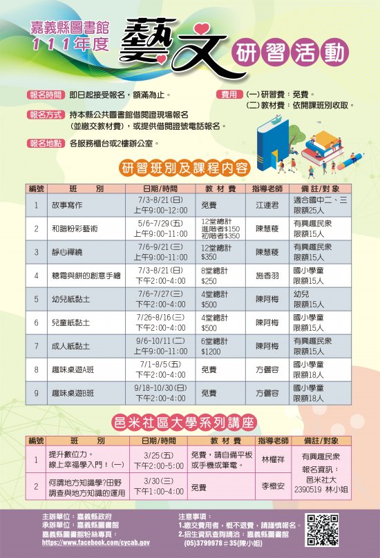 嘉義縣圖書館「111年度藝文研習活動」活動開跑囉~ 一、報名時間:即日起接受報名,額滿為止。 二、報名方式:持本縣公共圖書館借閱證現場報名(並繳交教材費),或提供借閱證號電話報名。 三、報名地點:嘉義縣圖書館各服務櫃台或2樓辦公室。 四、招生資訊查詢請洽:(05)3799978#35(陳小姐) 五、簡章、報名表下載處:https://tinyurl.com/u83fdh5r