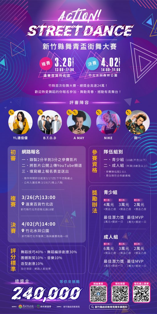 | 一、 | 為活絡青年族群才藝能量並加強互動,新竹縣特搭配青年節以青年喜愛之街舞運動為活動主軸,號召青年以競賽方式進行交流,展露活力;另兒童節適逢連假,為給孩子歡樂節日並促進親子情感,活動中除規劃青年街舞決賽表演外,亦安排適合闔家觀賞的各式演出,周邊也將設置主題市集、青年推廣攤位等,廣邀青年及親子族群一起參加活動,同歡連假節慶。 |