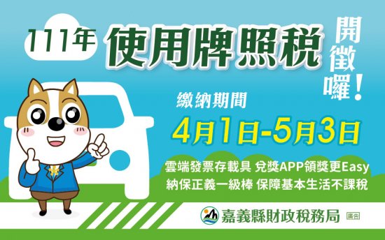 (一) 宣傳內容1:「111年使用牌照稅4月1日開徵! 請於5月3日前繳納111年使用牌照稅,以保障您權益,嘉義縣財政稅務局關心您!」。
