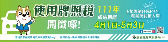 (四) 宣傳內容4:「111年使用牌照稅有獎徵答開始囉,500元禮券等著您來拿,詳細內容請至嘉義縣財政稅務局官網查詢。」