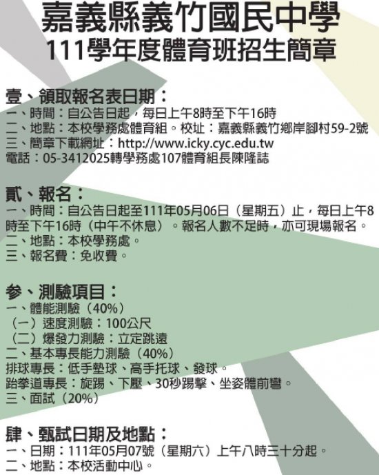 本校111學年度新生預計招收一年級體育專班1班(詳細簡章如附件)