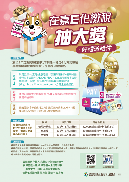 | 2、 | 活動資格與方式:於今年房屋稅定期開徵期開內,透過各項e化線上成功繳納「嘉義縣」111年定期開徵的房屋稅稅款,即可參加抽獎,有機會獲得5000元、300元或100元超商禮券。 |