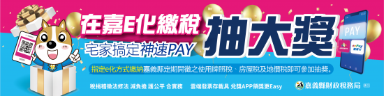 | (二) | 宣傳內容2:「以特定e化方式繳納嘉義縣房屋稅,即可參加『在嘉E化繳稅任你Pay 輕鬆便利抽大獎』抽獎活動,最大獎5,000元禮券!機會難得,心動不如馬上行動!」 |