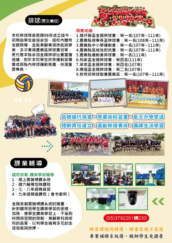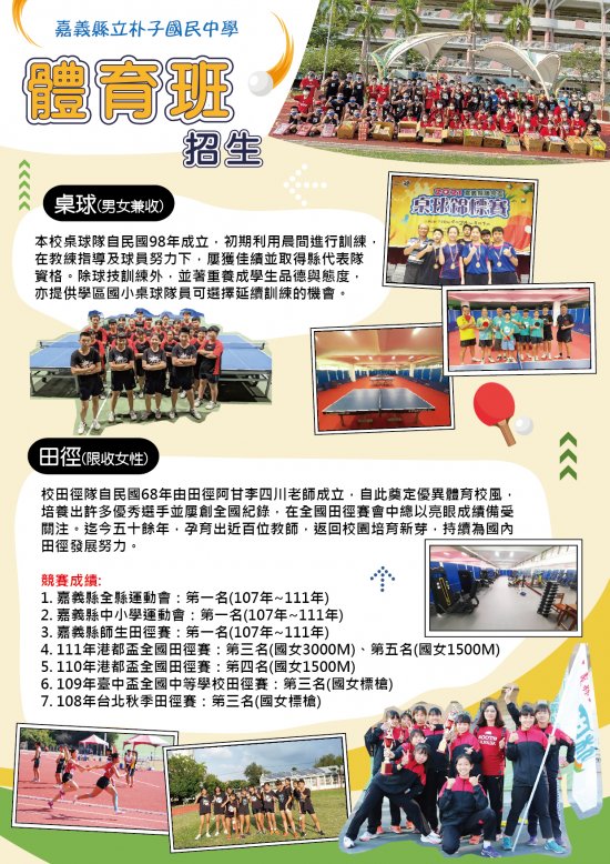 1.報名時間: 111 年 05 月 09 日起至 111 年 05 月 13 日 16:00 止。 2.甄選時間: 111 年 05 月 18 日(三)下午 14:30(14:20 報到)。 3.甄選項目:田徑(限收女性)、桌球(男女兼收)、排球(男女兼收)。 4.報名方式:現場報名。 5.甄選簡章書面資料索取地點:朴子國中體育組(嘉義縣朴子市大同路 245 號)。 6.其他甄選相關資訊詳如附件甄選簡章。