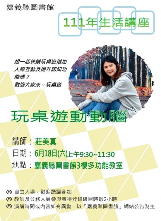 一、講師:莊美真 二、日期:6/18(六)9:30-11:30 三、地點:嘉義縣圖書館3樓多功能教室 四、參與對象:一般民眾 五、參加方式:免費,自由入場