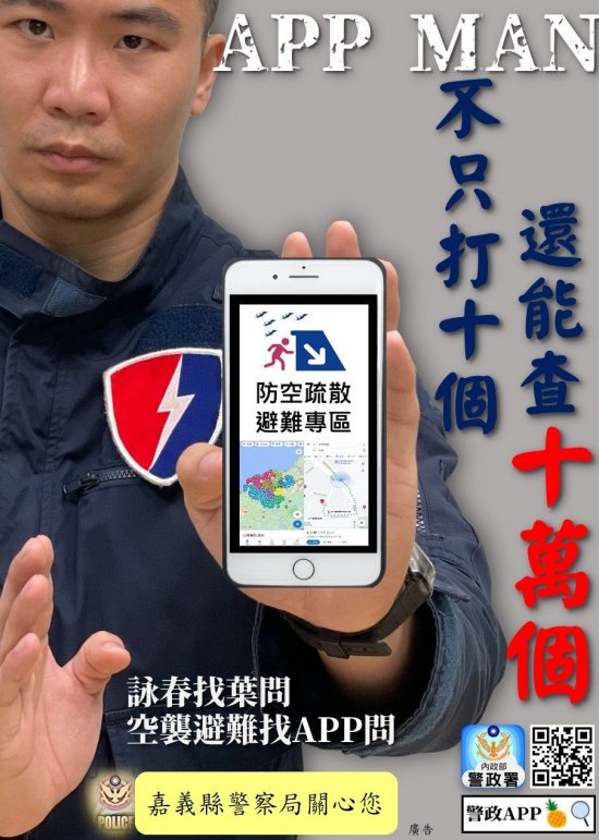 為加強熟悉空襲避難地點,請宣導師生多加利用手機下載使用內政部警政署「警政服務APP-防空疏散避難專區」及上網「嘉義縣警察局-防空疏散避難專區」網站,並點選防空疏散避難設施位置Google Map或掃描QR Code查詢就近之防空疏散避難處所。
