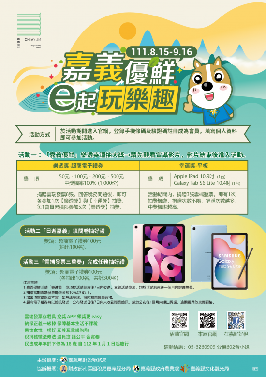 | 一、 | 為推廣統一發票兌獎APP及行動支付結合雲端發票,本縣財政稅務局結合結合嘉義縣特色食品、在地景點及租稅問答,爰本(111)年度舉辦「嘉義優鮮 e起玩樂趣」網路租稅宣導活動(以下稱本活動): |