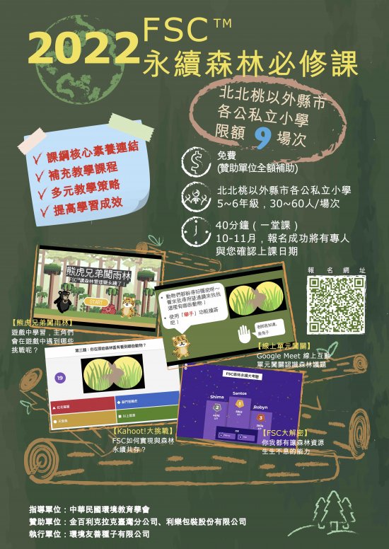 環境友善種子有限公司為落實森林環境教育理念,培育具備全球氣候變遷與環境保護視野之校園師生,預定辦理「FSC永續森林驗證之環境教育線上課程推廣計畫」