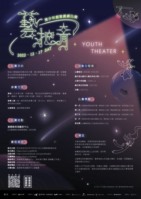 報名日期:即日起至111/11/13(日)止 決賽日期:111/12/17(六) 決賽地點:嘉義縣表演藝術中心 演藝廳 報名網址:https://reurl.cc/gMRLKb 簡章及附件下載網址:https://reurl.cc/9pAKqd