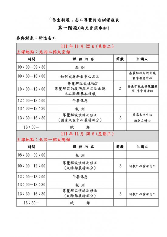 第一階段(新志工):111年11月 22 日、11月30日;兩天皆須參加,共2天。