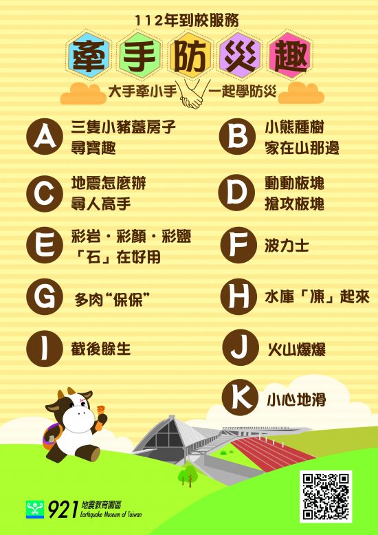 - 該園區致力於推廣地震科學、建築安全與防災教育,於寒假特別規劃了「牽手防災趣」到校服務活動,透過套裝課程,帶領學生從多元主題來認識地震與防災。