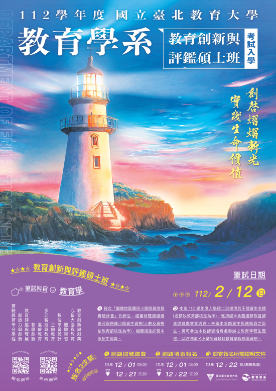 三、該系教育創新與評鑑碩士班考試入學筆試日期為112年2月12日(星期日)。筆試科目:教育學。