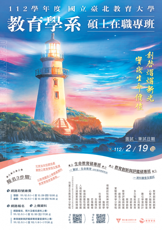 五、詳細招生資訊請參閱該校教育學系網站(https://de.ntue.edu.tw)及招生系統(https://diceexam.ntue.edu.tw/)。