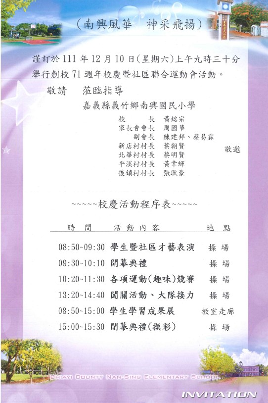義竹鄉南興國小訂於111年12月10日(星期六)辦理71週年校慶暨社區聯合運動會,歡迎各界長官來賓蒞臨指導,並於111年12月12日(星期一)補假一天,若有公務聯繫請逕洽相關承辦人員。
