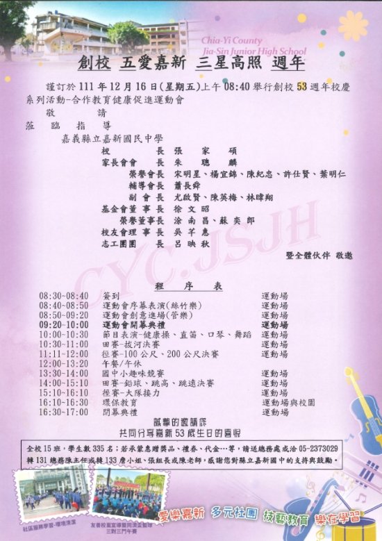 校慶:縣立嘉新國中謹訂於111年12月16日(星期五)上午九時舉辦111學年度(創校53週年)校慶運動會,歡迎長官、各界來賓、家長及校友蒞臨指導!
