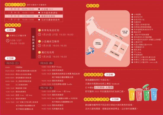 1/25-1/27 連續三天,除了可以參觀展覽,看看 3D 電影,還有藝術團體表演、文創市集、新春 DIY 課程活動,歡迎你來盡情熱舞,歡樂過新年!