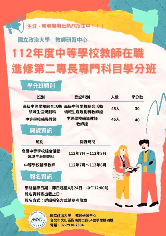 五、正班及隨班附讀網路報名登錄至112年5月19日(星期五)13:00止,詳細資訊請參閱所附簡章內容或至該校教師研習中心網頁( http://tisec.nccu.edu.tw )查詢。聯絡電話:(02)2938-7894。