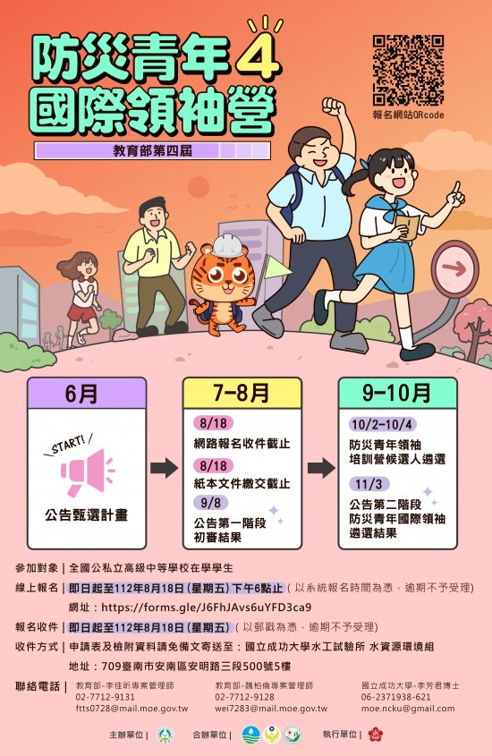 為使學生掌握全球防災教育推動趨勢,並培養學生災害風險意識、防災知能、態度與多元文化素養,透過國內培訓及國際教育交流,強化團隊合作精神、解決問題及領導能力,特辦理防災青年國際領袖營。