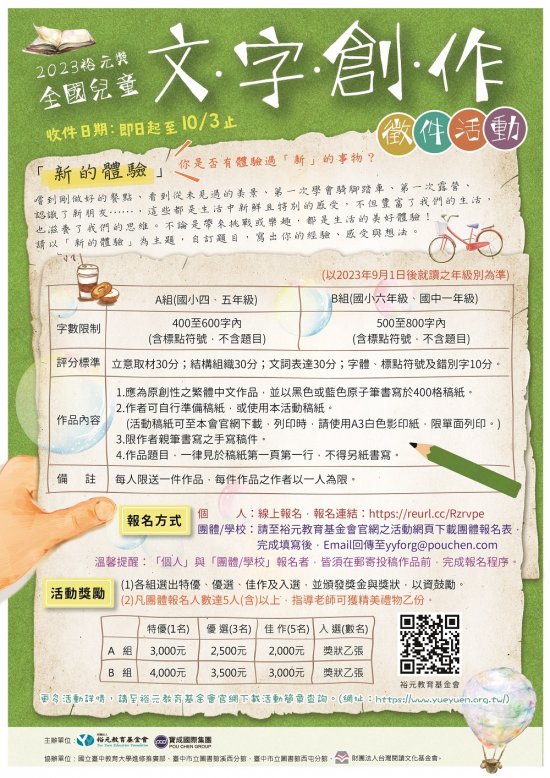 六、活動詳情及獎勵說明請至裕元教育基金會網站(https://www.yueyuen.org.tw/)詳見活動簡章。