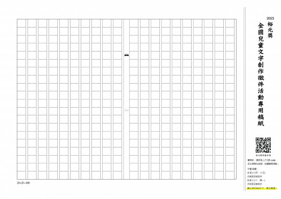 1、限作者親筆書寫之手寫稿件,且以黑色或藍色原子筆書寫於400格之稿紙。(可自行準備稿紙,或至活動網頁下載活動稿紙。)