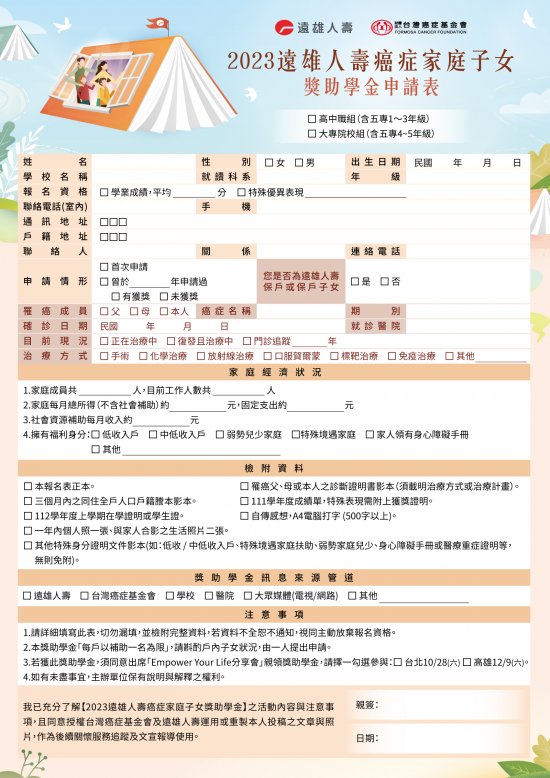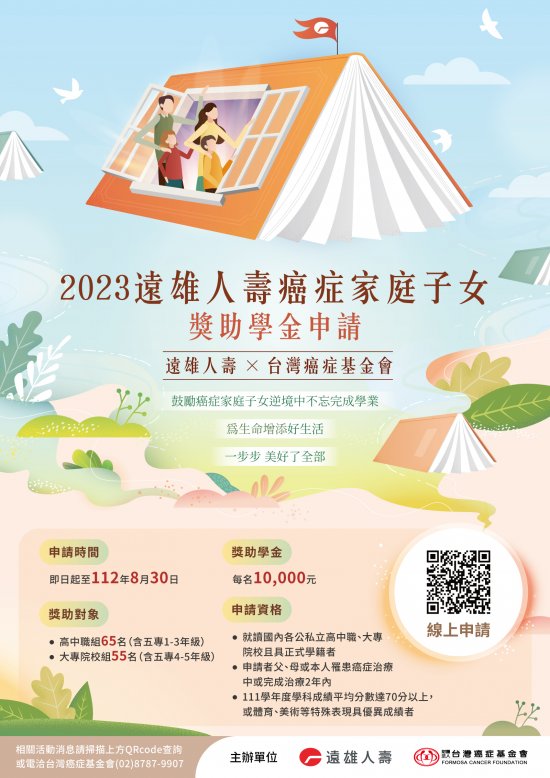 五、檢附「2023臺灣癌症基金會x遠雄人壽-癌症家庭子女獎助學金」活動DM1份(如附件),旨揭訊息亦公告於本縣教育資訊網。