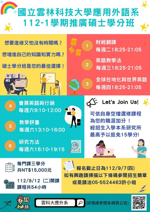 (四) 會展英語與行銷:112年9月16日至113年1月13日,每週六上午9時10分至12時。